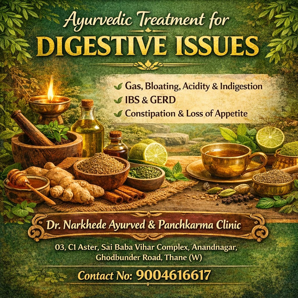 πΏ Ayurvedic Treatment for Digestive Issues: Restore Gut Health Naturally Digestive problems are among the most common health concerns today. Issues like acidity, bloating, constipation, gas, and indigestion can affect daily life and overall well-being. Ayurveda offers a natural and holistic approach to treating digestive disorders by addressing the root cause and restoring balance in the body. π Common Digestive Issues * Indigestion (Ajeerna) * Acidity (Amlapitta) * Constipation (Vibandha) * Gas and bloating * Loss of appetite * Irritable bowel tendencies π± Ayurvedic Perspective on Digestion In Ayurveda, digestion is governed by Agni (digestive fire). Strong Agni leads to proper digestion, absorption, and elimination, while weak Agni results in toxin formation (Ama) and disease. The three doshas also play a role: * Vata imbalance β Gas, bloating, constipation * Pitta imbalance β Acidity, heartburn, inflammation * Kapha imbalance β Slow digestion, heaviness, loss of appetite βοΈ Causes of Digestive Problems * Irregular eating habits * Overeating or undereating * Consumption of junk and processed food * Excessive spicy or oily food * Stress and anxiety * Lack of physical activity * Poor sleep routine πΏ Ayurvedic Treatment Approach Ayurveda focuses on improving digestion, eliminating toxins, and restoring dosha balance. 1. Herbal Remedies * Triphala β Improves digestion and relieves constipation * Hing (Asafoetida) β Reduces gas and bloating * Jeera (Cumin) β Enhances digestion and appetite * Ajwain β Relieves indigestion and stomach discomfort * Ginger β Stimulates digestive fire 2. Panchakarma Therapies * Virechana (Purgation) β Effective for acidity and Pitta disorders * Basti (Medicated Enema) β Best for Vata-related digestive issues * Deepana-Pachana therapies β Improve digestion and metabolism 3. Diet & Eating Habits Ayurveda emphasizes mindful eating: β Follow: * Eat warm, freshly cooked meals * Maintain regular meal timings * Chew food properly * Eat only when hungry β Avoid: * Cold and refrigerated food * Overeating * Eating late at night * Mixing incompatible foods 4. Lifestyle Changes * Wake up early and follow a routine * Practice light exercise or walking * Avoid sleeping immediately after meals * Manage stress effectively 5. Home Remedies * Drink warm water throughout the day * Take ginger with rock salt before meals * Use buttermilk with roasted cumin after meals * Consume herbal teas (fennel, coriander) π§ββοΈ Yoga for Better Digestion * Pavanamuktasana (Gas-relieving pose) * Vajrasana (after meals) * Bhujangasana * Anulom Vilom Pranayama These practices help improve digestion and reduce stress. πΈ When to Consult an Ayurvedic Doctor If digestive issues are chronic or severe, professional consultation is necessary for personalized treatment based on your body constitution. πΏ Conclusion Digestive health is the foundation of overall wellness in Ayurveda. By strengthening Agni, removing toxins, and following a balanced diet and lifestyle, you can naturally overcome digestive issues and enjoy better health. Ayurveda not only treats the symptoms but restores harmony within the body for long-lasting relief. Ayurvedic treatment for Digestive issues Kasarvadavali Ayurvedic treatment for Digestive issues Hiranandani Ayurvedic treatment for Digestive issues Thane
