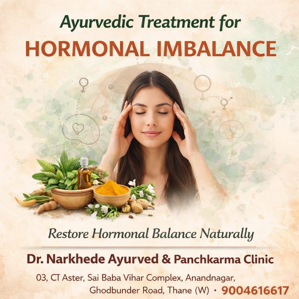 Hormonal Imbalance in Ayurveda: A Natural Path to Balance Hormones play a vital role in regulating almost every function in the body—from metabolism and mood to reproductive health and sleep. When these hormones go out of balance, it can lead to a variety of health concerns. Ayurveda, the ancient Indian system of medicine, offers a holistic and natural approach to restoring hormonal harmony. What is Hormonal Imbalance? Hormonal imbalance occurs when there is too much or too little of a hormone in the bloodstream. Even small changes can have a significant impact on overall health. Common Symptoms: * Irregular periods * Weight gain or difficulty losing weight * Acne and skin problems * Hair fall or thinning hair * Mood swings, anxiety, or depression * Fatigue and low energy * Sleep disturbances Ayurvedic Perspective on Hormonal Imbalance In Ayurveda, hormonal imbalance is not seen as a single disease but as a disruption in the body's doshas—Vata, Pitta, and Kapha. * Vata imbalance may cause irregular cycles, anxiety, and dryness * Pitta imbalance can lead to inflammation, acne, and irritability * Kapha imbalance may result in weight gain, sluggish metabolism, and cyst formation The root cause often lies in poor digestion (Agni) and accumulation of toxins (Ama) in the body. Causes of Hormonal Imbalance (According to Ayurveda) * Improper diet (junk food, excessive sugar, processed food) * Stress and emotional disturbances * Sedentary lifestyle * Lack of proper sleep * Environmental toxins * Irregular daily routine Ayurvedic Treatment Approach Ayurveda focuses on treating the root cause rather than just managing symptoms. 1. Detoxification (Panchakarma) Panchakarma therapies help eliminate toxins and restore balance. Common treatments include: * Virechana (therapeutic purgation) * Basti (medicated enema) * Abhyanga (herbal oil massage) 2. Herbal Remedies Certain Ayurvedic herbs are known to support hormonal balance: * Ashwagandha – Reduces stress and supports adrenal health * Shatavari – Excellent for female reproductive health * Guduchi – Boosts immunity and detoxifies the body * Triphala – Improves digestion and detoxification 3. Diet & Nutrition A balanced diet is essential in Ayurveda: * Eat fresh, warm, and home-cooked meals * Include seasonal fruits and vegetables * Avoid processed, fried, and sugary foods * Use spices like turmeric, cumin, and fennel 4. Lifestyle Modifications * Follow a consistent daily routine (Dinacharya) * Practice yoga and meditation regularly * Ensure 7–8 hours of quality sleep * Manage stress through pranayama and relaxation techniques Yoga & Pranayama for Hormonal Balance * Surya Namaskar * Bhujangasana (Cobra Pose) * Setu Bandhasana (Bridge Pose) * Anulom Vilom Pranayama * Bhramari Pranayama These practices help regulate endocrine function and reduce stress. 🌸 When to Consult an Ayurvedic Doctor If symptoms persist or worsen, it is important to seek professional guidance. Personalized Ayurvedic treatment can help restore balance naturally and safely. 🌿 Conclusion Hormonal imbalance can affect your quality of life, but Ayurveda offers a safe, natural, and holistic approach to healing. By addressing the root cause through detoxification, herbs, diet, and lifestyle changes, you can regain balance and improve overall well-being. Treat Hormonal Imbalance with Ayurveda Ghodbunder Road Treat Hormonal Imbalance with Ayurveda Kasarvadavali Treat Hormonal Imbalance with Ayurveda Manpada